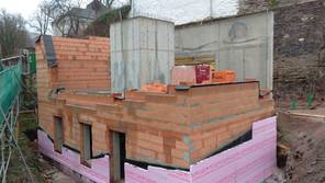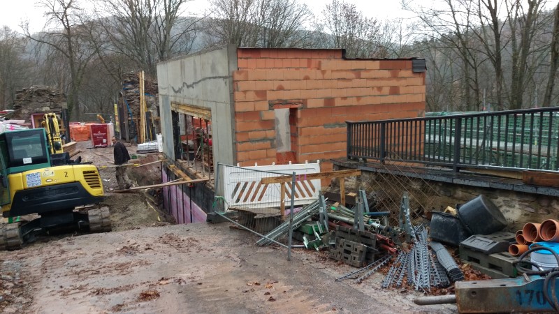 Das erste Geschoss des Torhausteils linksseitig der Schlosszufahrt, mit Aufzugschacht und Treppenhaus, ist so gut wie fertiggestellt.